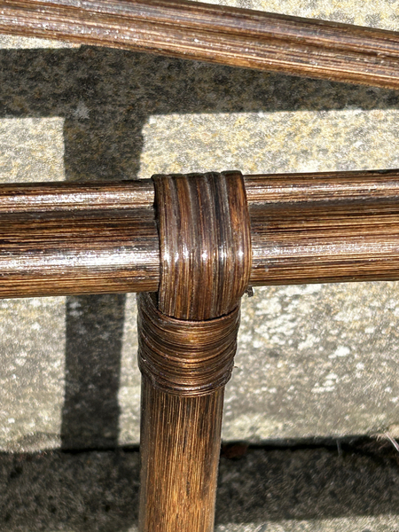 Sa structure est en bambou, ses attaches en rotin et le cannage en forme de paon rayonnant est en osier tressé.