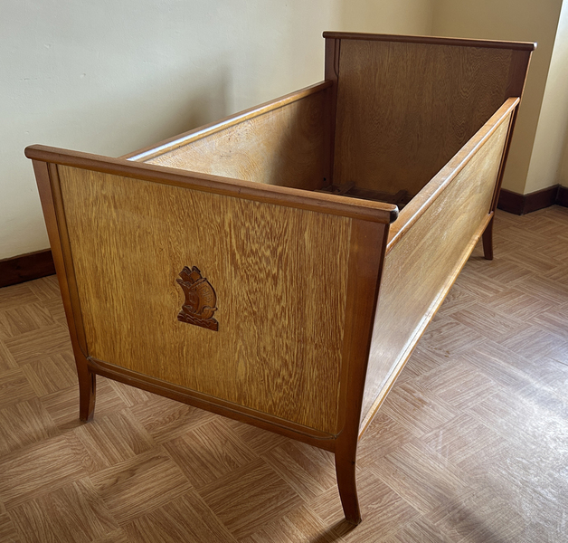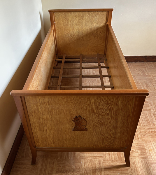 Adorable et charmant lit de bébé en bois, couleur chêne moyen.