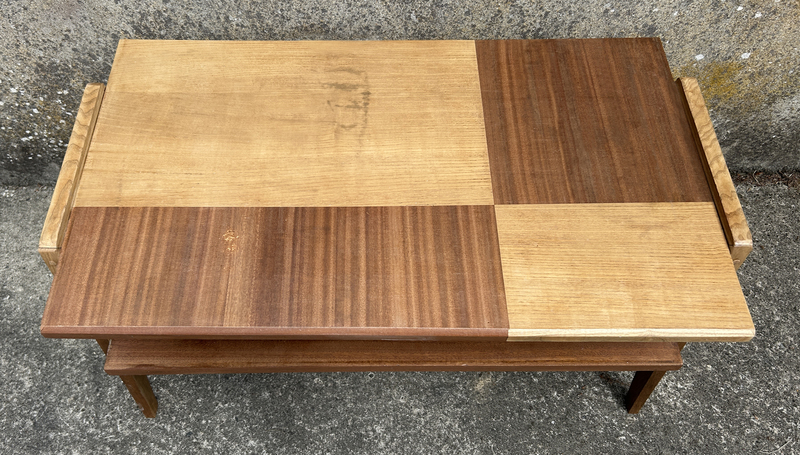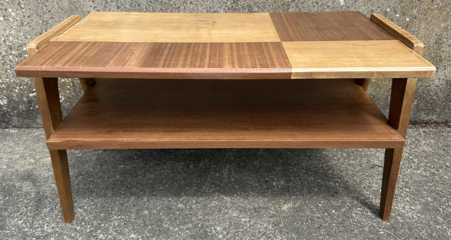 le plateau est subtilement travaillé : différents sens de la trame de bois acajou,