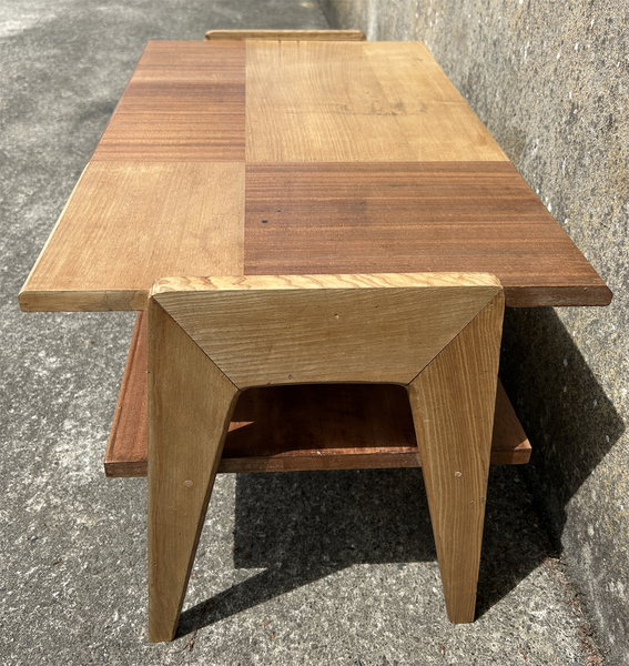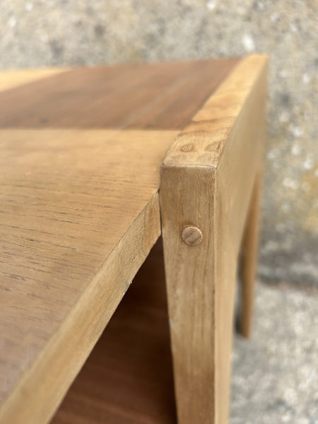 Deux plaquages de tonalité différente, chêne clair et chêne moyen, décorent le plateau supérieur. Véritable menuiserie artisanale, cette table a été chevillée bois.