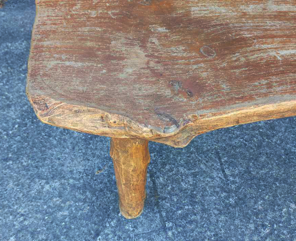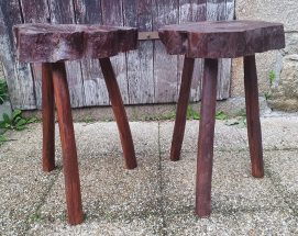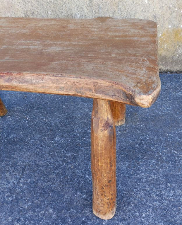 une petite table tripode, accompagnée de ses deux tabourets en forme de croissant de lune.