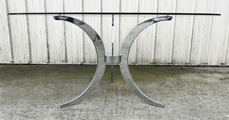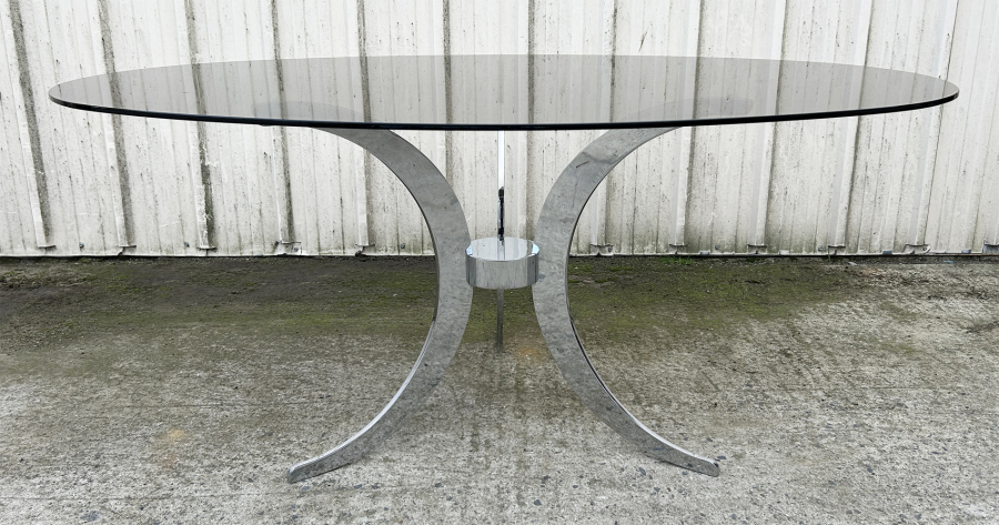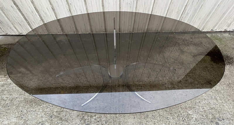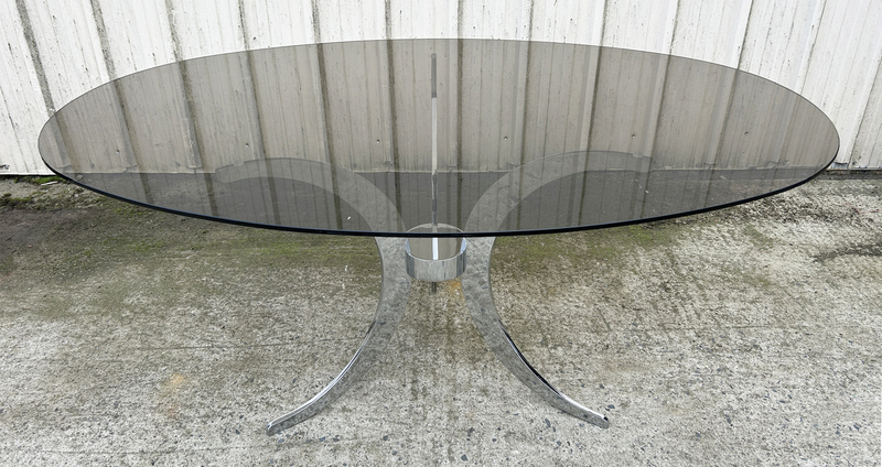 Table emblématique des années 70, constitué d'un magnifique pietement tripode en acier chromé massif et lourd en croissant de lune et d'un plateau épais ovale en verre fumé.