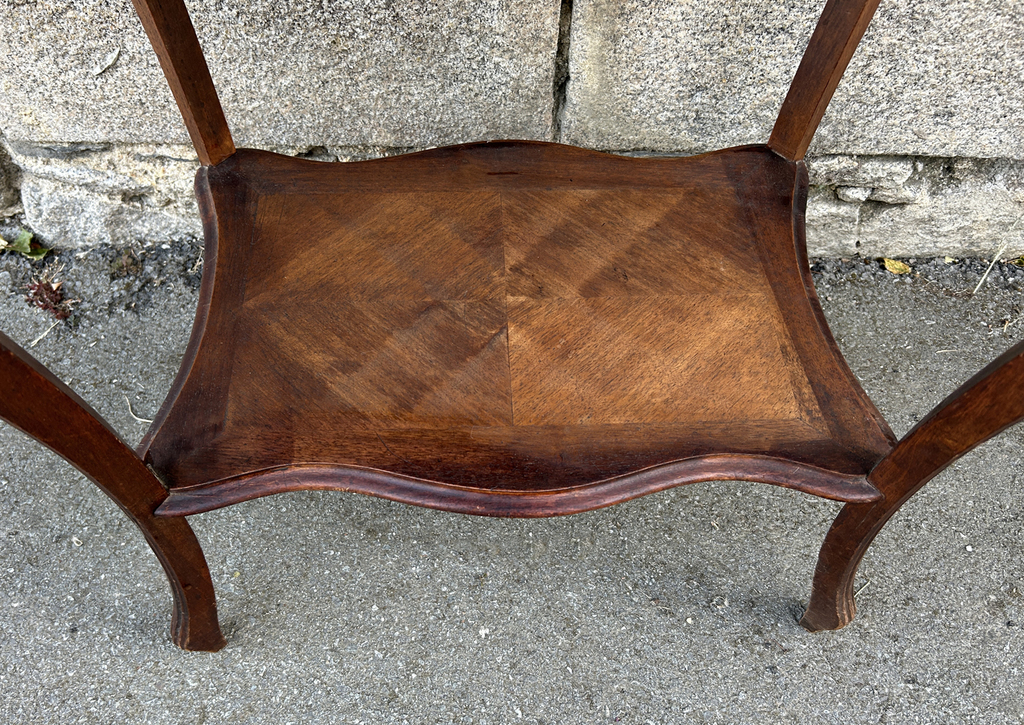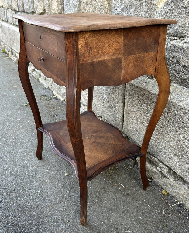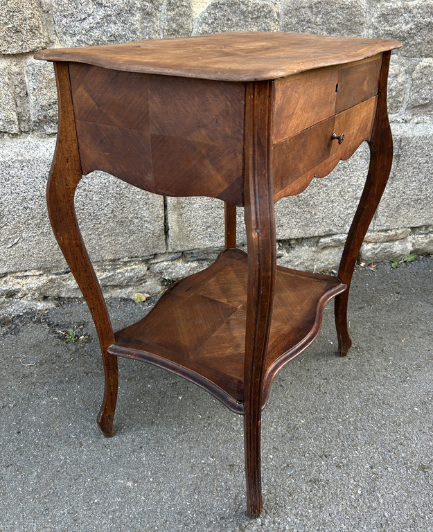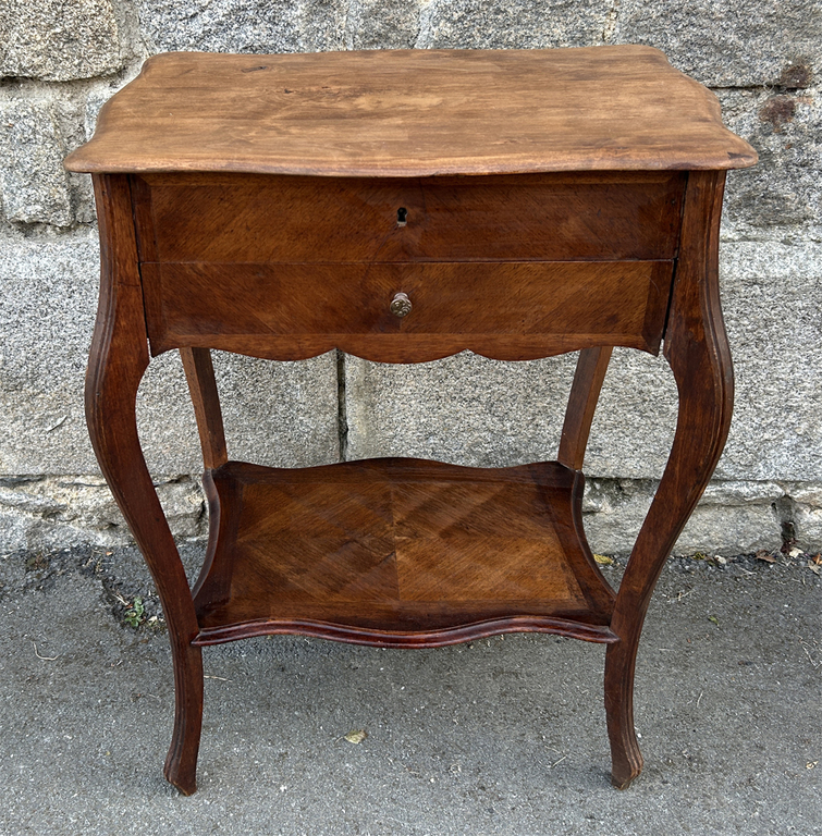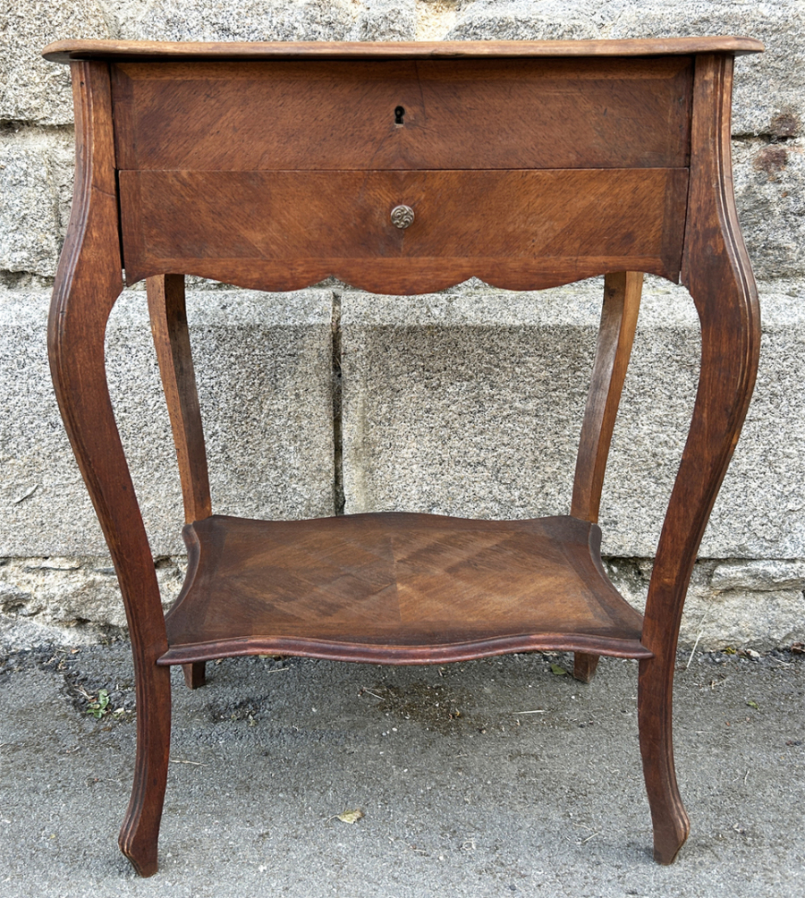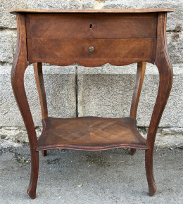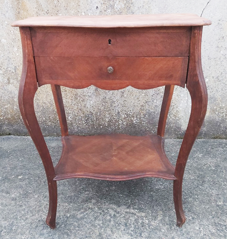 Pour la petite histoire : Ce petit meuble très en vogue au XIXe siècle reprend les teintes qui ont fait la signature de Jean-François Oeben, ébéniste du roi en 1754. C'est sous Napoléon III que le regain d'intérêt pour ces esthétiques de l'ancien régime prend de l'ampleur grâce à l'impératrice Eugénie qui voue un culte sentimental pour la reine Marie-Antoinette. Elle remet au goût du jour le style Louis XVI en inventant son propre style en plein milieu du XIXe siècle : le style Louis XVI-Impératrice. De nombreux autre styles "anciens" et même étrangers découleront de cette mode : Chinois, Japonais, Regency, Renaissance, Gothique et bien évidemment Louis XV, à l'image de notre petite table à ouvrage. (source HN).
