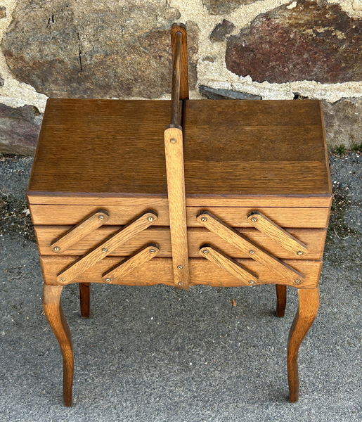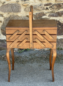 Travailleuse, boîte à couture en bois, sur pied, vintage, années 50