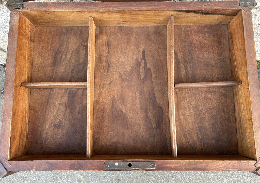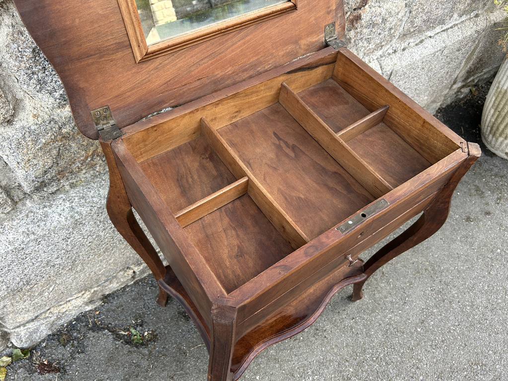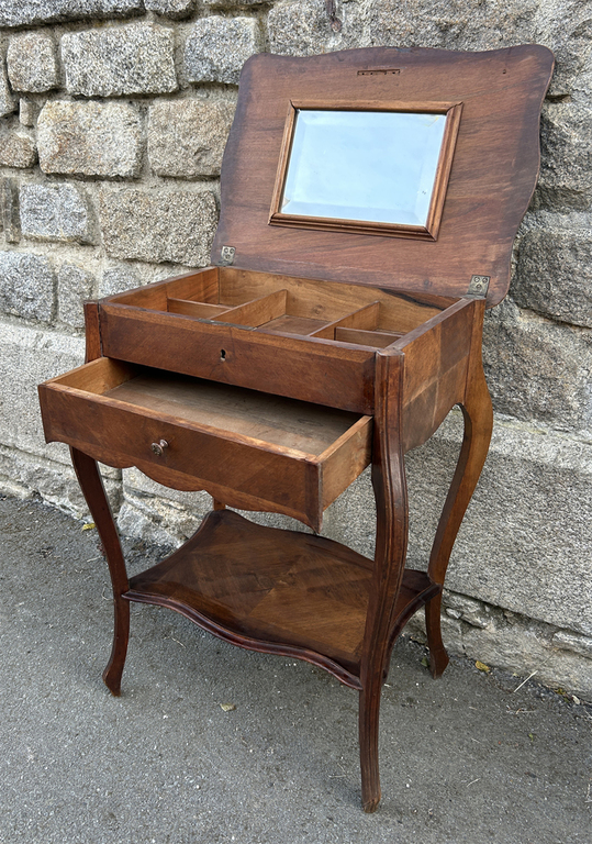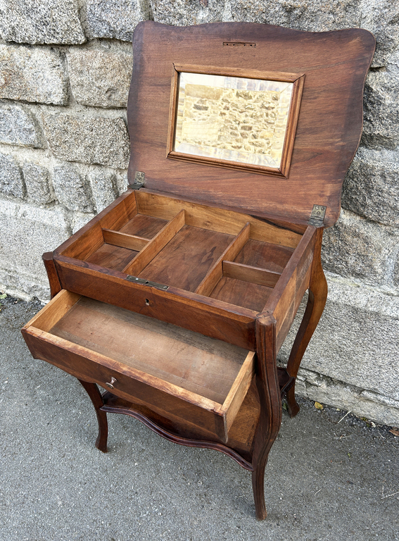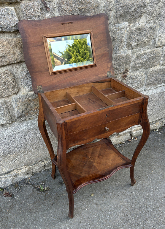 Présence d'un tiroir en façade et d'un miroir épais et biseauté sur son contour sous le couvercle du dessus qui renferme un espace à cinq compartiments, charnières en laiton et prise du tiroir en bronze. La clef est absente.