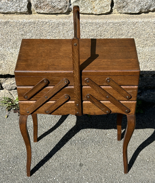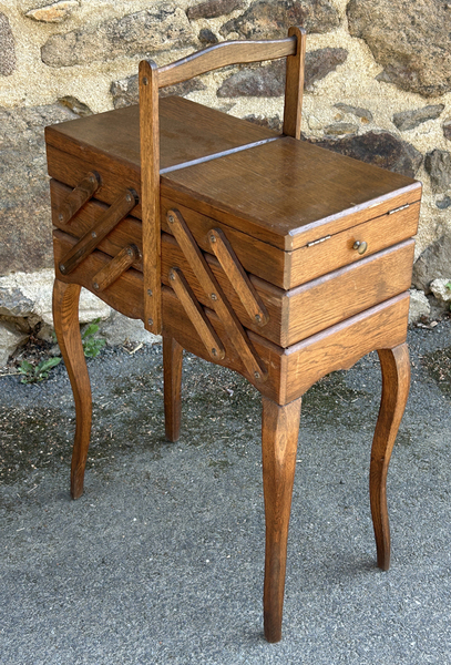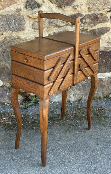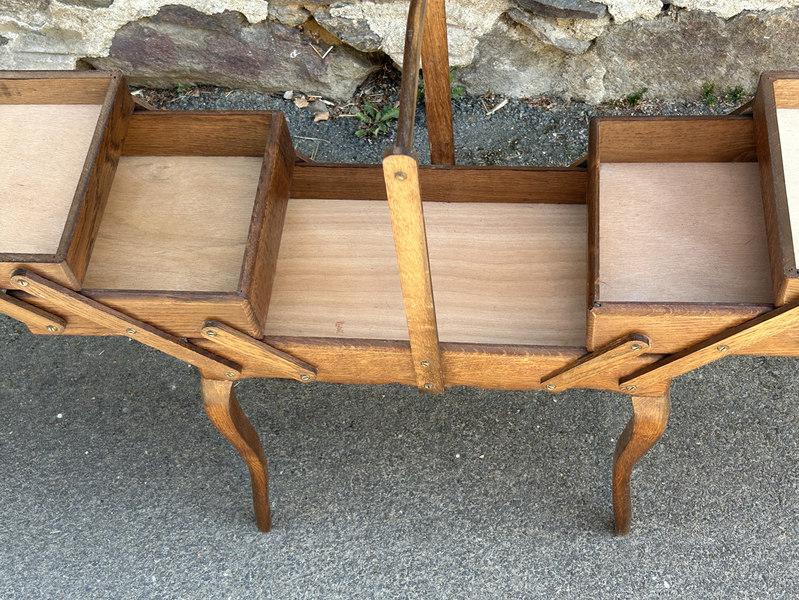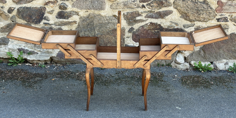 travailleuse sur pied dépliante à 3 compartiments, deux grands tiroirs à ouvrage et un tiroir composés de multiples petits compartiments.