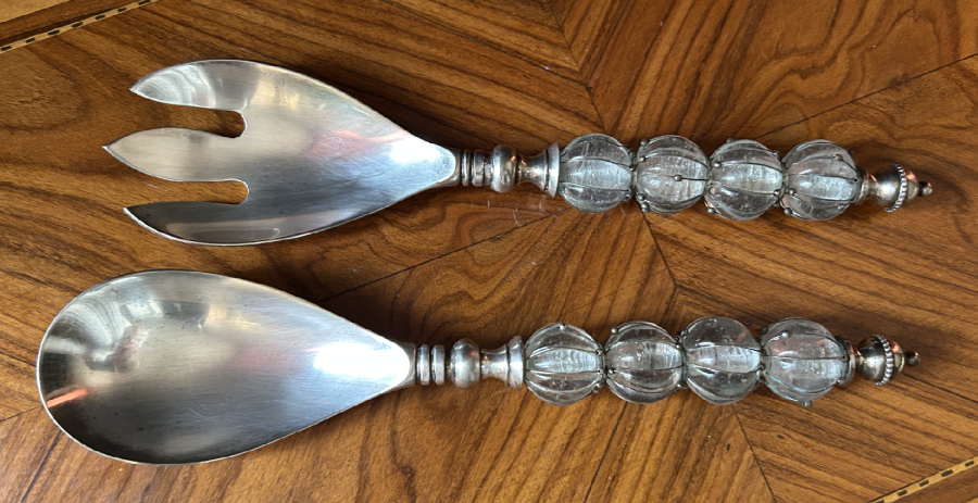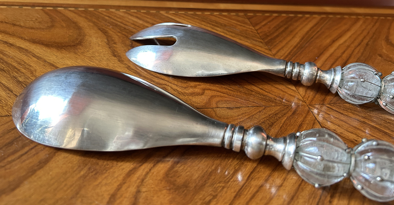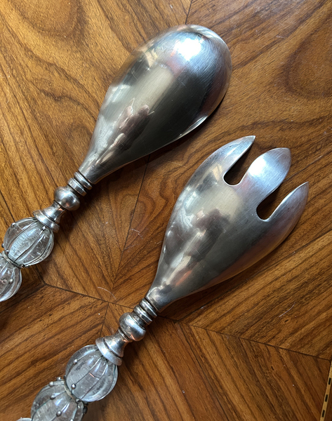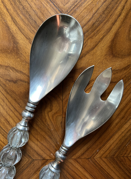 Service à salade vintage – métal argenté et poignées en verre soufflé