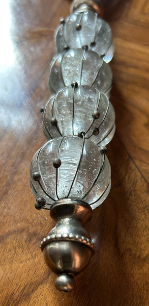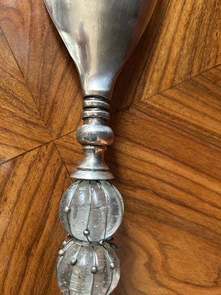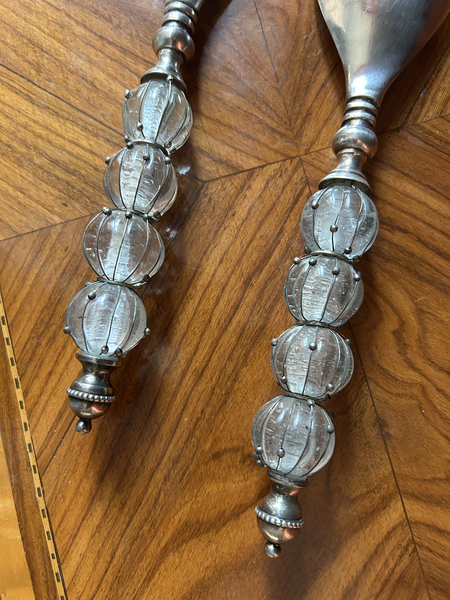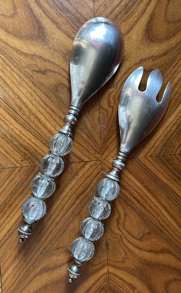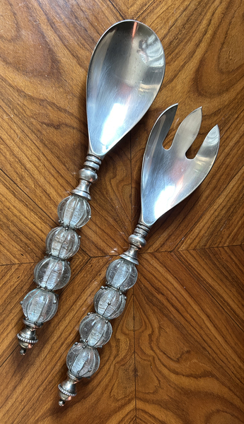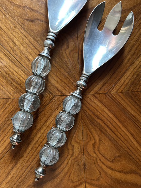 Superbe service à salade au design élégant, composé d’une grande cuillère et d’une grande fourchette en métal argenté, dotées de magnifiques manches en perles de verre soufflé, finement travaillées.