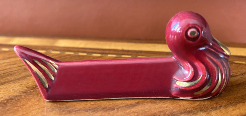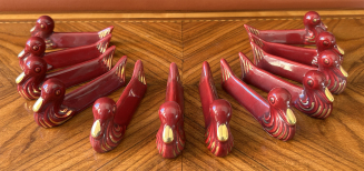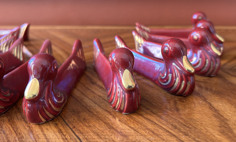 Magnifique ensemble de douze repose-baguettes en céramique émaillée rouge profond, représentant des canards stylisés ornés de détails dorés peints à la main.