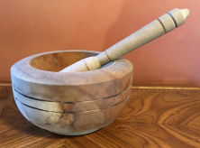 Ce mortier a des parois épaisse et une cavité tournée. Son pilon droit est en deux parties tournées égalment et deux anneaux décoratifs. Il est en bois clair, érable ou hétre.
