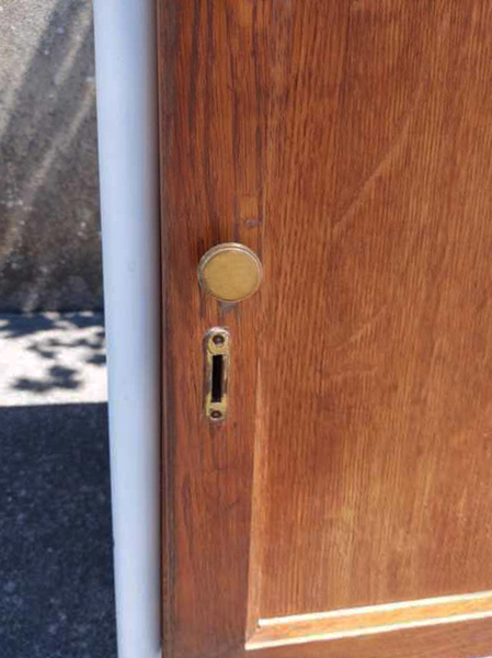Dans sa partie gauche, entièrement restaurée on trouve une penderie, la base est en panneau perforé permettant l'aération du meuble. dans sa partie droite un petit placard comprenant une tablette et un tiroir. Deux jolies poignées en laiton.