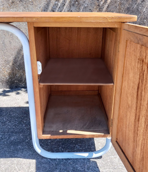 Le bureau moderniste vintage (modèle DLG) est composé d'une structure tubulaire blanche au design typique du créateur designer, d'un plateau en chêne massif et d'un caisson en bois. Petite poignée de laiton.