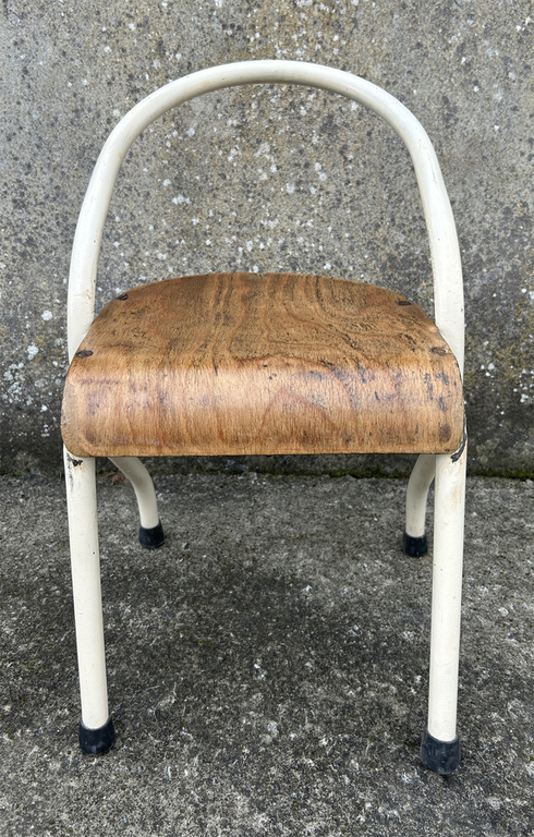 Elle a conservé les traces de son histoire. C'est une chaise à structure tubulaire peinte "Education nationale". Son bandeau et son dossier sont en contre-plaqué. Cette chaise de collectivité a été réalisée après guerre et elle est inscrite dans le catalogue de l'UGAP (Union des Groupements d'Achat Publics)