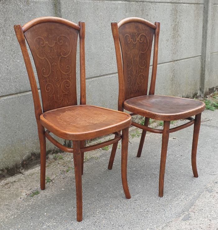 Réalisées en hêtre massif courbé et assise décor pressé selon la technique créée par Thonet au XIXème siècle.