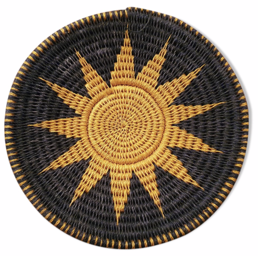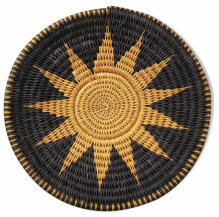 Fabriqué artisanalement au Boswana à partir de fibres naturelles, ce joli panier représente un soleil ocre jaune sur fond noir.