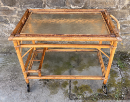 Née dans les années 60, à une époque où la dolce vita s’invitait jusque dans le mobilier, cette desserte roulante en rotinincarne la légèreté et la convivialité du style Riviera. Sa ligne sobre, ses entrelacs manuels et ses plateaux en verre martelérappellent les terrasses ouvertes sur la mer et les apéritifs d’été sans fin.