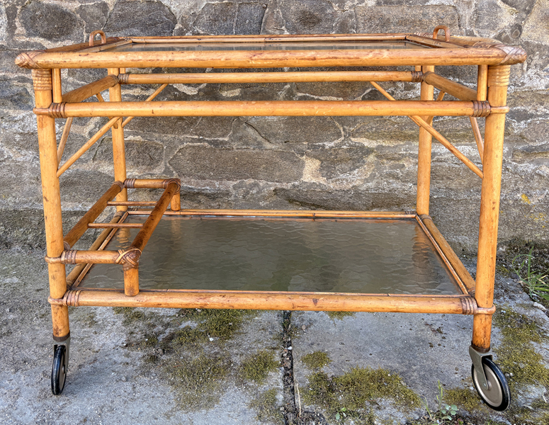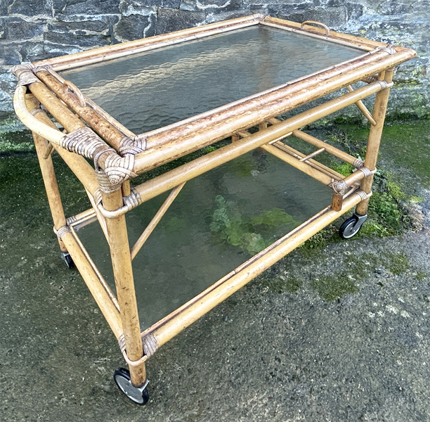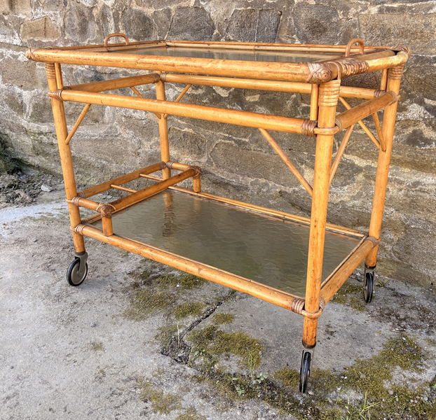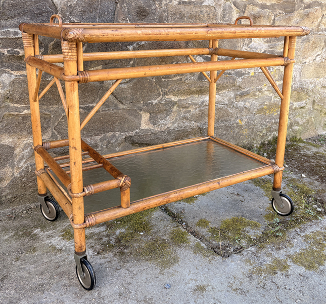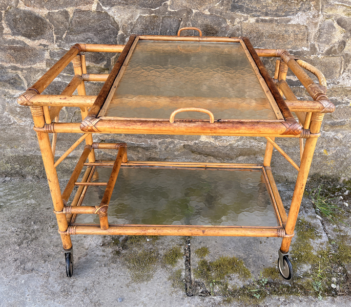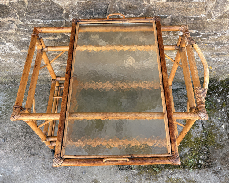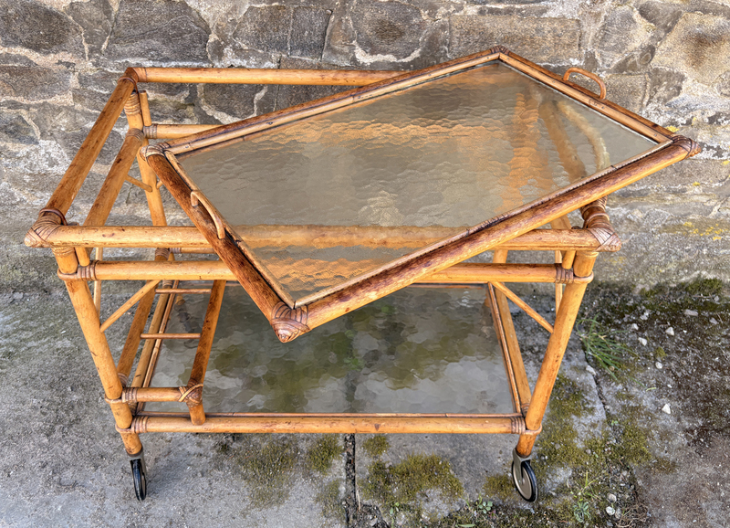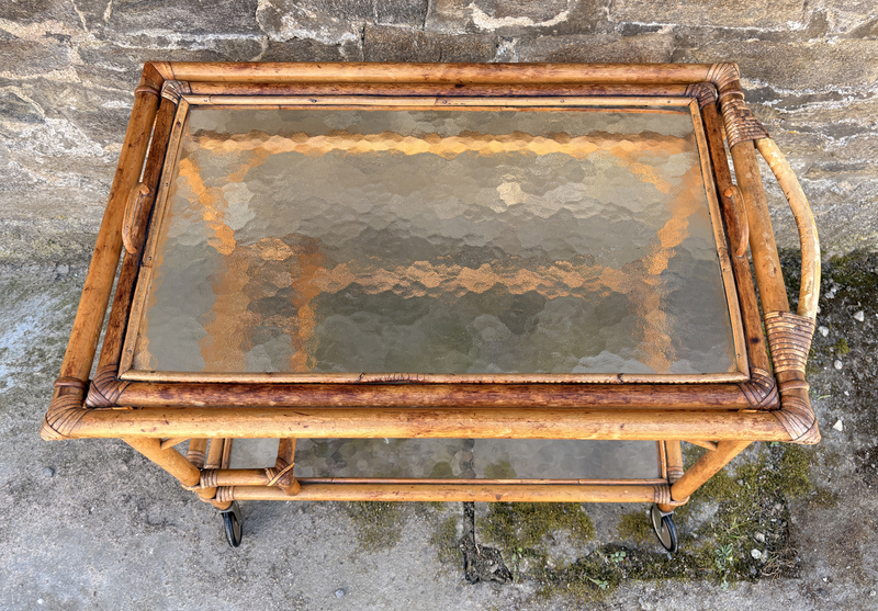 Desserte roulante vintage en rotin et verre fumé avec plateau amovible, style Riviera, années 1960