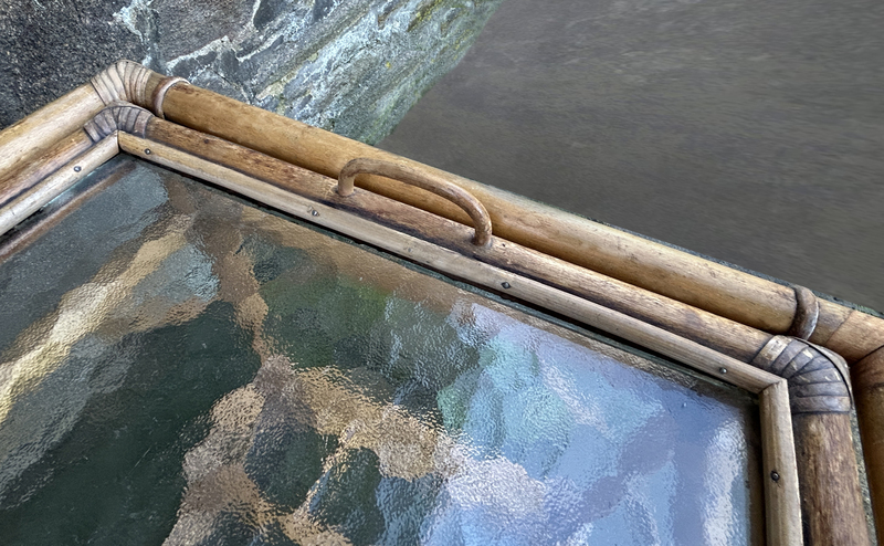 Sa structure est en bambou sélectionné de très haute qualité et en forme de gerbe de blé, typique des créations de Mac Guire, son plateau est recouvert d'un verre épais.