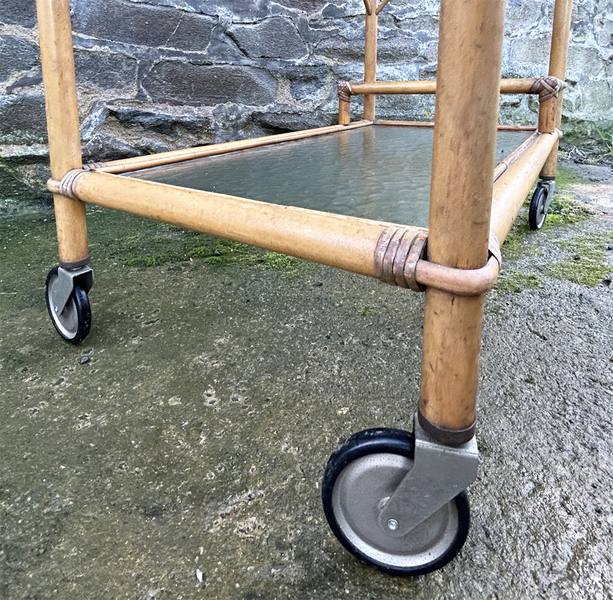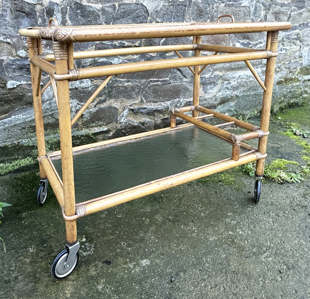 Soutenue par ses roulettes d’origine et une structure en rotin patinée par le temps, cette pièce offre une double fonction décorative et pratique. Cette pièce se classe parmi les incontournables du mobilier vintage chic, un souffle rétro à faire rouler jusque chez vous.